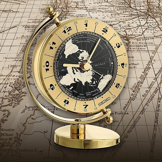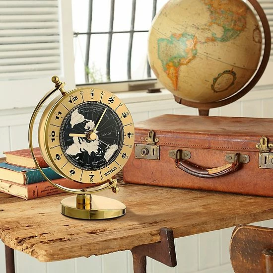 For the traveller. A world time function and birds-eye globe view give this clock function and style. Dress up any tabletop with this impressive gold-tone clock.
