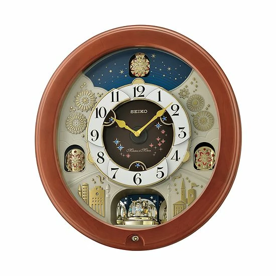 Illuminate your home decor with this whimsical Seiko wall clock featuring bright LED lights and a rotating pendulum. On the hour, the dial opens to reveal a turning wheel decorated with sparkling crystals, while the clock plays one of 18 melodies.