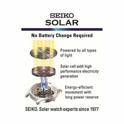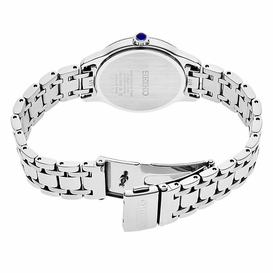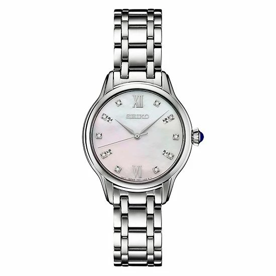 Featuring a mother-of-pearl dial with diamond accent markers, this women’s Seiko watch is a captivating timepiece.